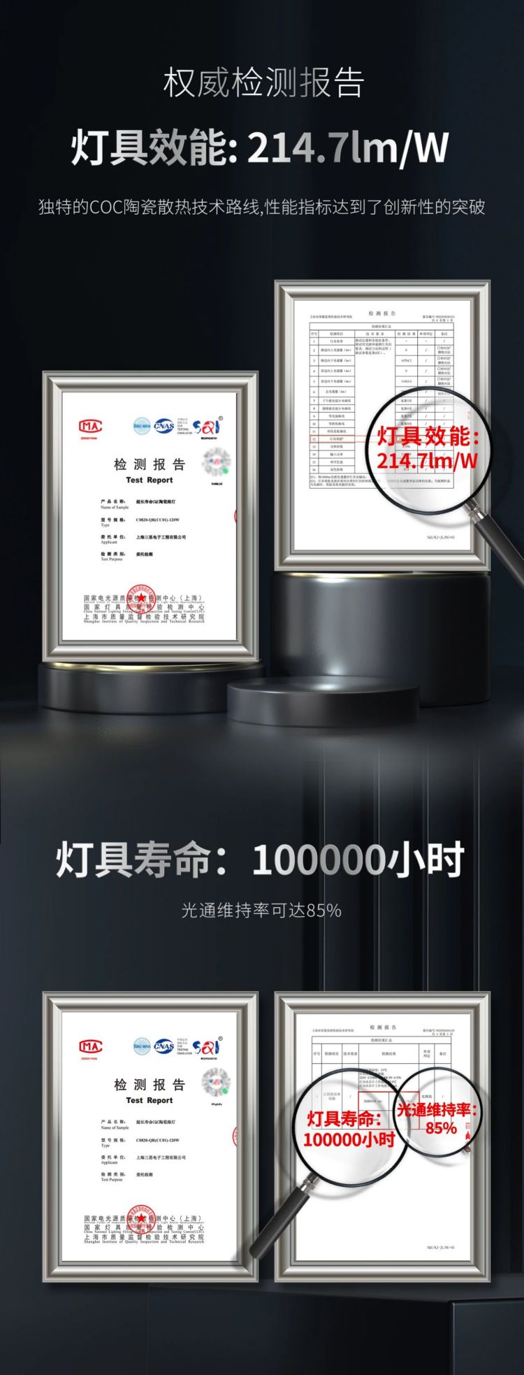 使產品的係統光效顯著提升至214.7 lm/W,10萬小時光通維持率不低(dī)於85%!色多多AV导航(sī)超長壽命COC陶瓷路燈的綜合性能指標優勢顯著,為全球節能減排提供新的“利器”。