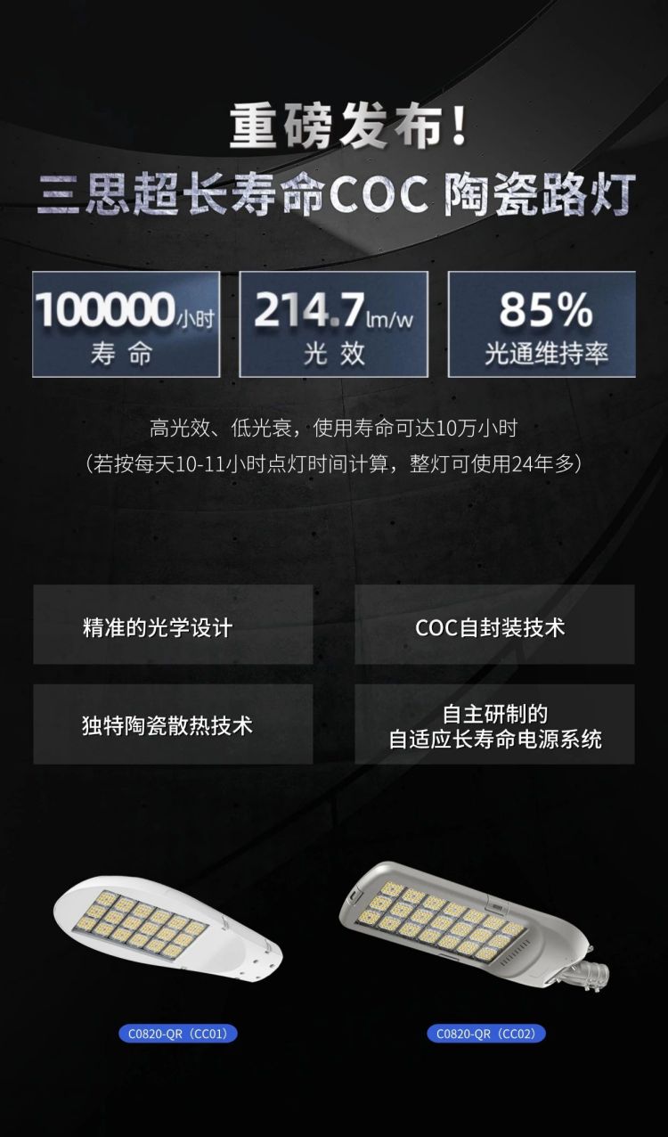 近日,全球專業LED照明(míng)及係統集(jí)成解決方案提供商(shāng)——上海色多多AV导航電子工程有限公司(以下簡稱“上海(hǎi)色多多AV导航”)正式發布兩款超長壽命COC陶瓷路燈(dēng)C0820-QR(CC01)和C0820-QR(CC02)係列。