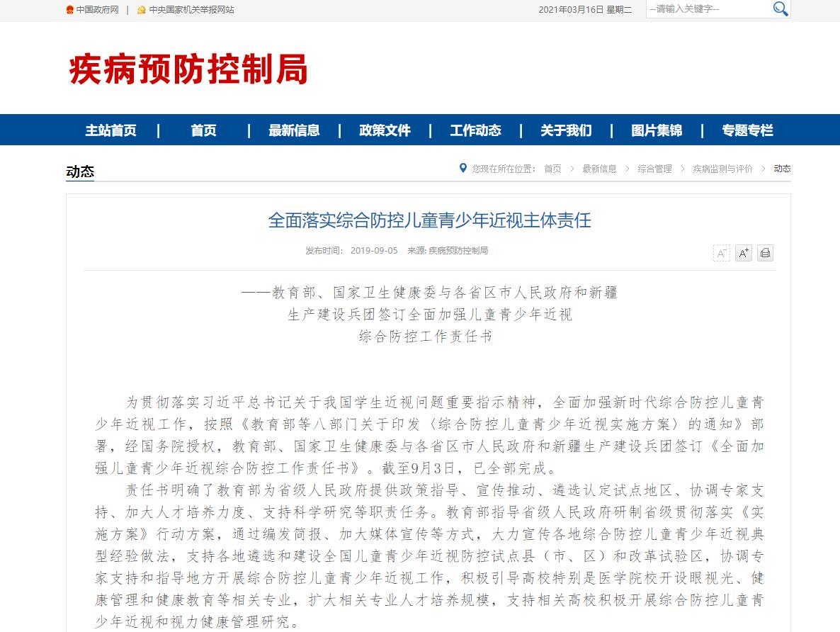 2019年(nián),教育部、國家衛生健康委與多個省級人民政府簽訂(dìng)《全麵加強兒(ér)童青少年近視防控工(gōng)作責任(rèn)書》,到2023年。力爭實現全國(guó)青少年總體近視率在2018年的基礎上每年(nián)降低0.5個百分點以上,近視高(gāo)發省份每(měi)年降低1個百(bǎi)分(fèn)點(diǎn)以上。