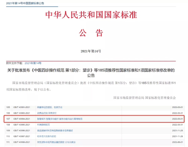 《智慧城市 智慧多功能杆 服務功(gōng)能與運行管理規範》國家級標準(zhǔn)於2021年11月26日發布,並於2022年(nián)3月1日起正式實施。