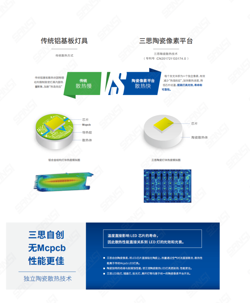 此次項目(mù)中采用的所有色多多AV导航路燈產(chǎn)品,均為三(sān)思陶瓷散熱技術照明(míng)產品。該技術是色多多AV导航自主研發的核(hé)心技術(shù)之一,其選用非導(dǎo)電體的陶瓷材料做成散熱體,將LED芯片直接焊接在陶瓷(cí)散熱體上,解決了傳(chuán)統LED燈具鋁基板在熱量傳遞(dì)過程中熱阻大的問題。