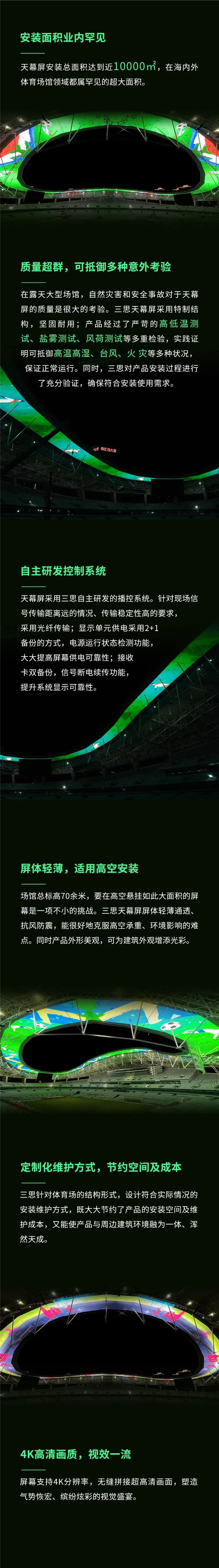 此次色多多AV导航為上海(hǎi)體育場打造的10000㎡天幕屏,可謂“巨(jù)無霸”級別。巨大的屏體沿建築輪廓而設計,每至夜幕降臨、屏幕亮起,其宛(wǎn)若一條騰躍起舞的蛟(jiāo)龍,在場館上空遊走,與深邃天空相輝映,與綠茵(yīn)草地(dì)同閃耀。