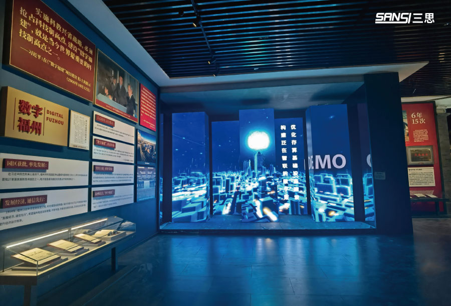 顯示屏將頂(dǐng)部(bù)、牆麵和地麵連為一體,視覺(jiào)上形成完整的(de)空間,視(shì)頻畫麵加上聲光電技術的共同作用,滿足了沉浸感的需求,向所有參觀者更(gèng)生動地展現了(le)福州的騰飛故事,激發參觀者對於福州曆史的求(qiú)知欲,以身臨其境的體(tǐ)驗融入福州故事中,形成強烈、有趣的互動(dòng)。