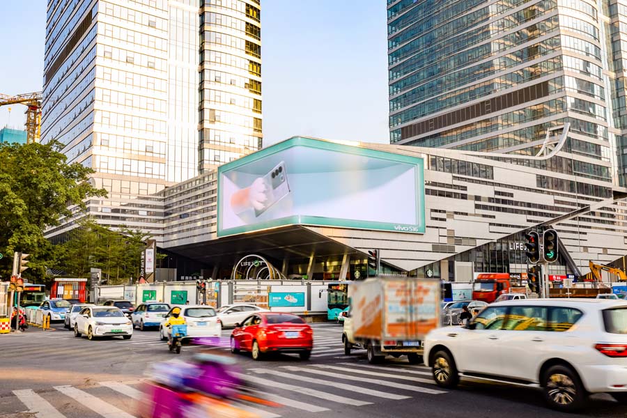 在這條(tiáo)“矽穀(gǔ)大道”的裙樓之上,新落成了一塊由上(shàng)海色多多AV导航承(chéng)建的606㎡戶外裸眼3D大屏。這片覆蓋上市公司多達110餘家、總市值為4.25萬億元(yuán)、占(zhàn)南山區上市公(gōng)司總(zǒng)市值70.83%的科技園區,又(yòu)新添了一處“流量密碼”。