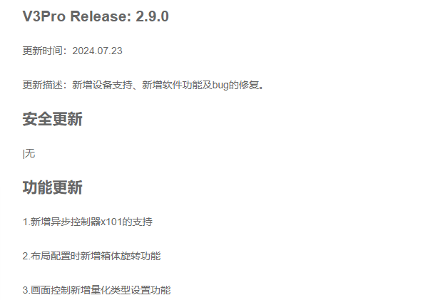 查看詳細 >>V3Pro Release: 2.9.0更新(xīn)時間(jiān):2024.07.23更(gèng)新描述:新增設備支持、新(xīn)增軟件功能及bug的修複。