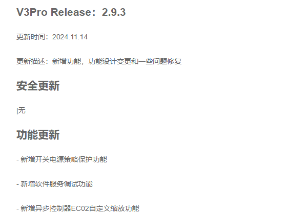 V3Pro Release:2.9.3更新時(shí)間:2024.11.14更新描述:新增功能,功能設計(jì)變更和一些問題(tí)修複
