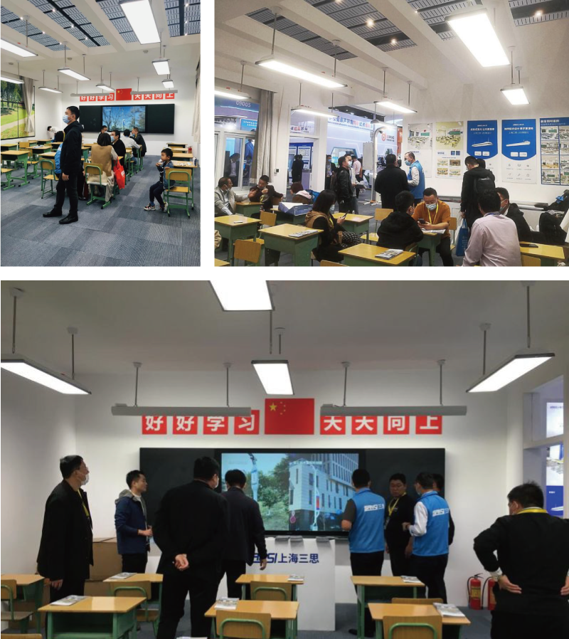在展會現場,觀眾通過實物對比(bǐ)及燈光體驗,現場直接感知色多多AV导航反射式發光技術教室(shì)燈和黑板燈的創新之處,以及AAAAA教室的優越健康光環境,大受觀眾歡迎。
